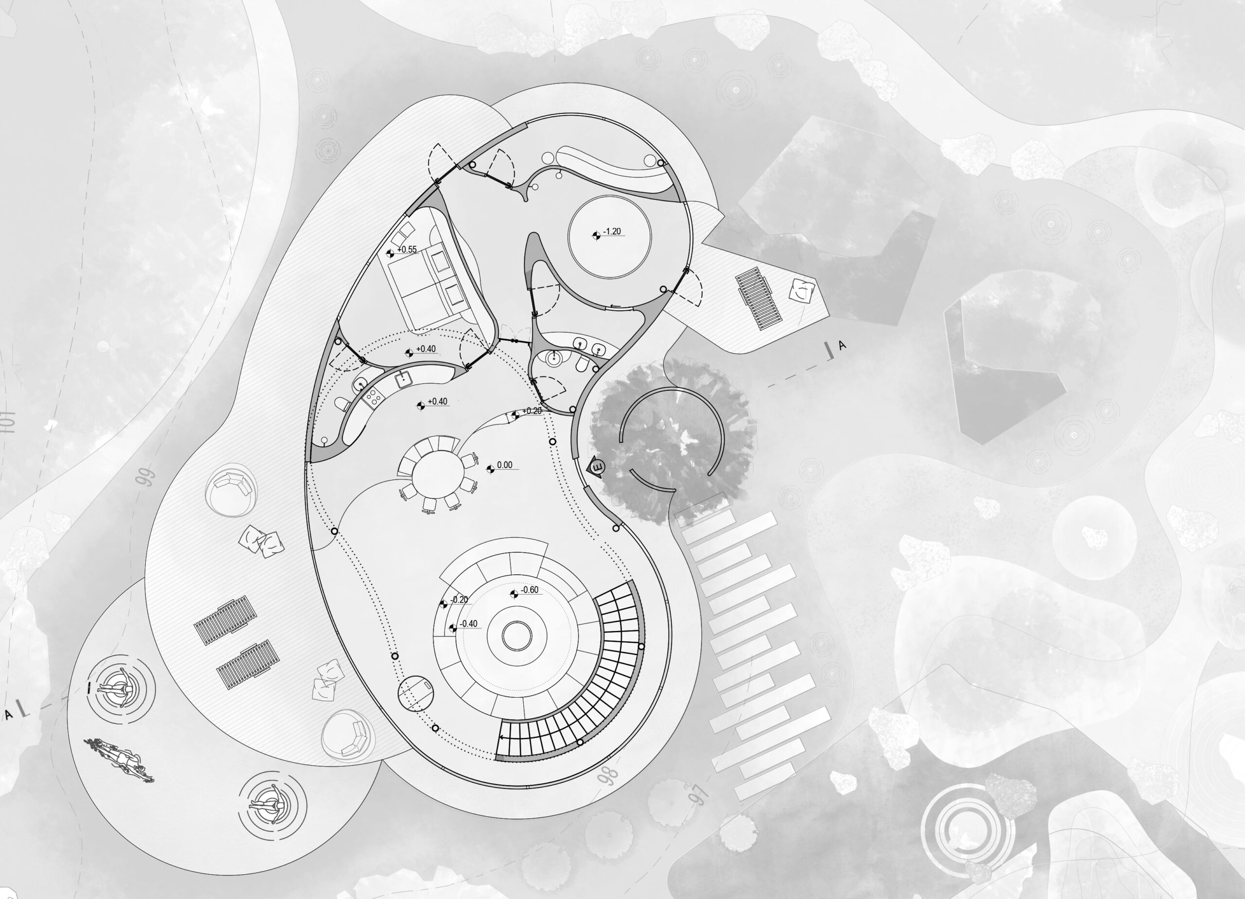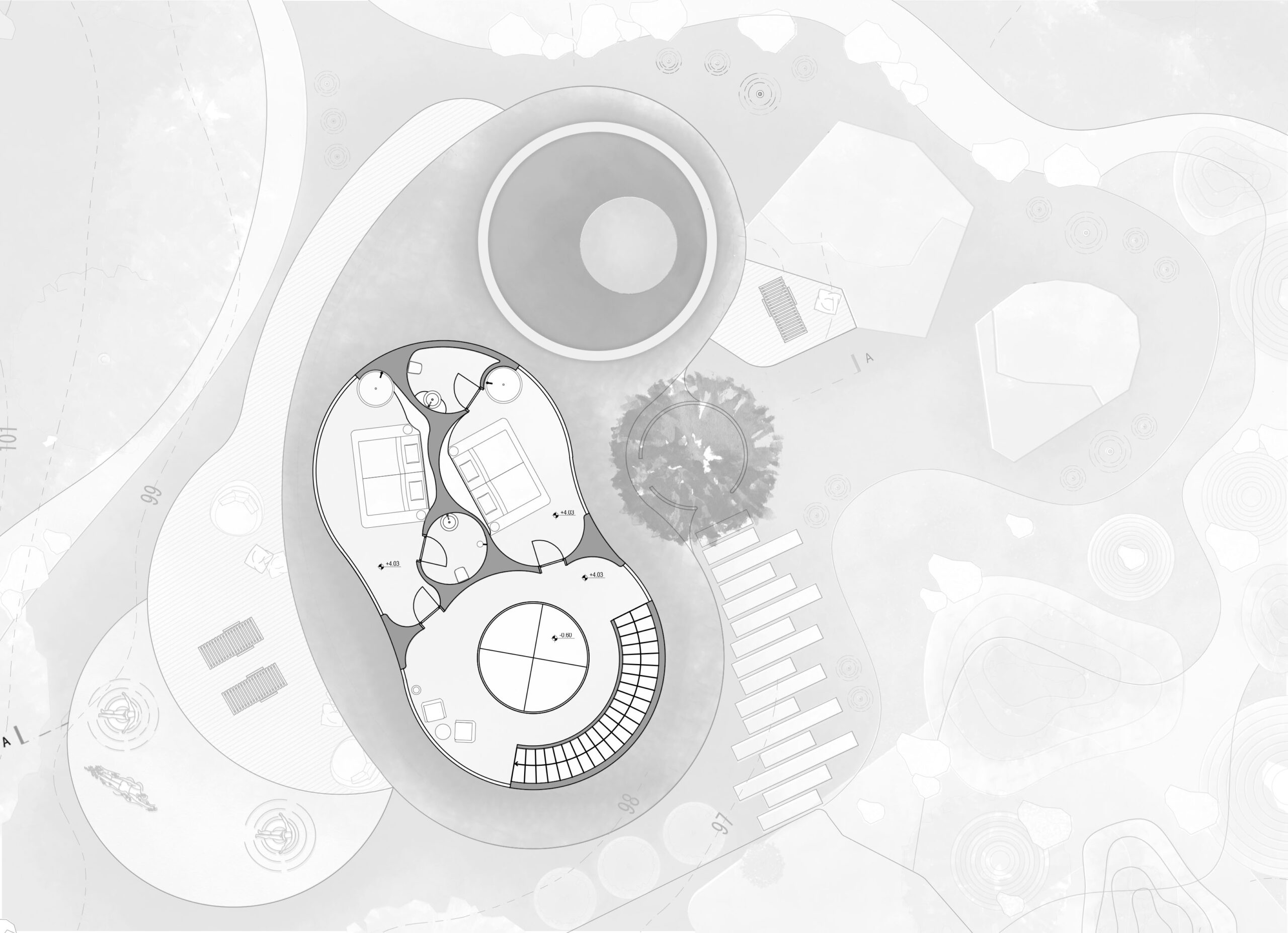 The building is conceived not as a mass pressing onto the ground, but as a light intervention resting on natural traces.