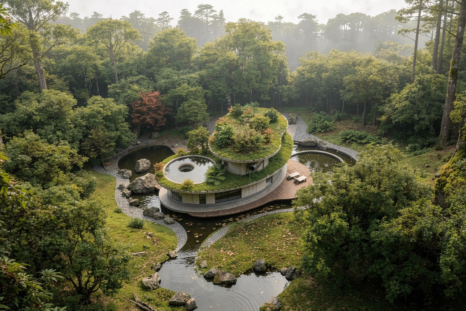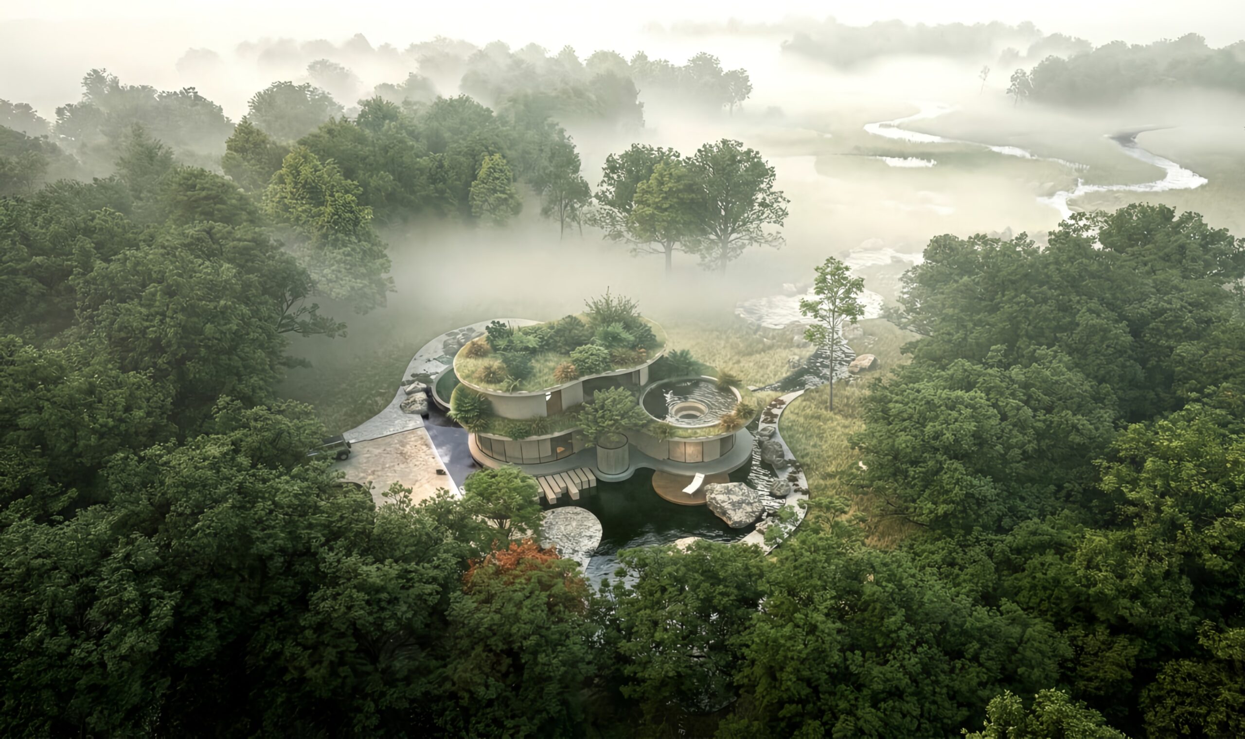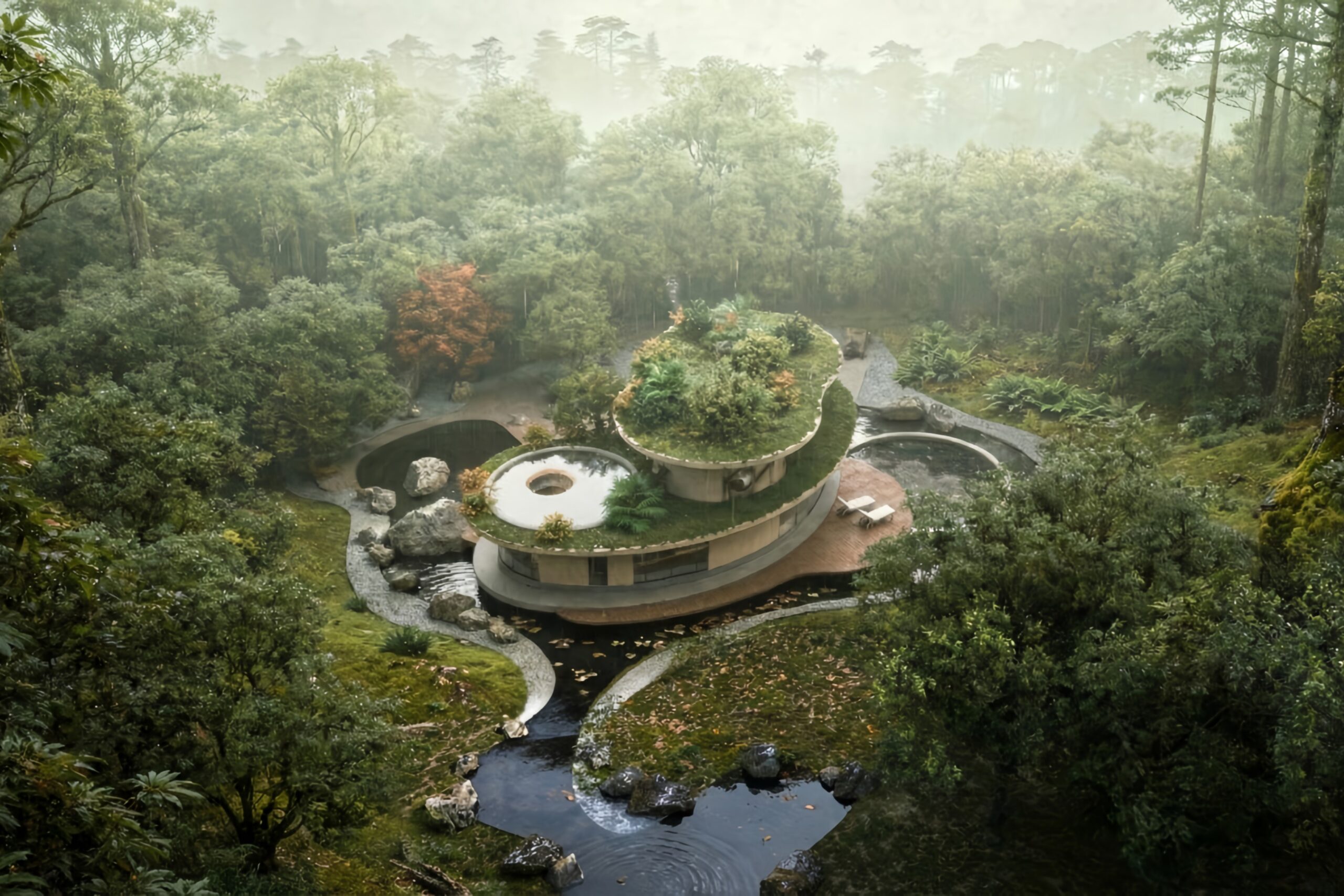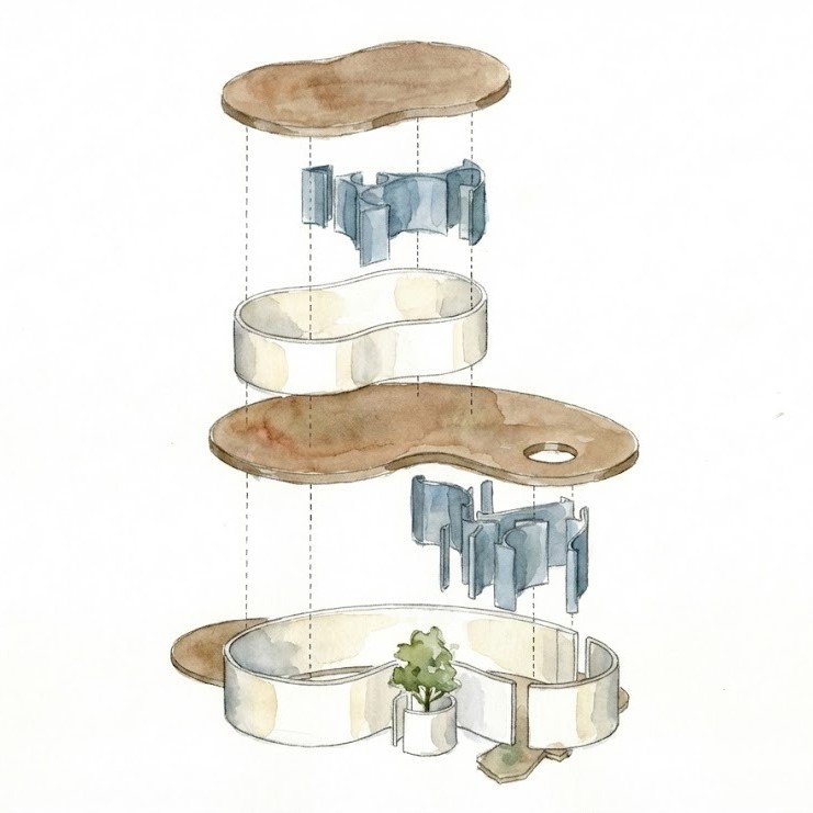 The spiral of a human fingerprint, the growth rings of Yakusugi cedar trees, and ripples formed by raindrops express a shared continuity across scales. Informed by this trace language, the mass bends with topography and water direction. Circulation unfolds from an inner core outward like a spiral, creating moments of pause. Cedar and stone record time, climate, and memory.