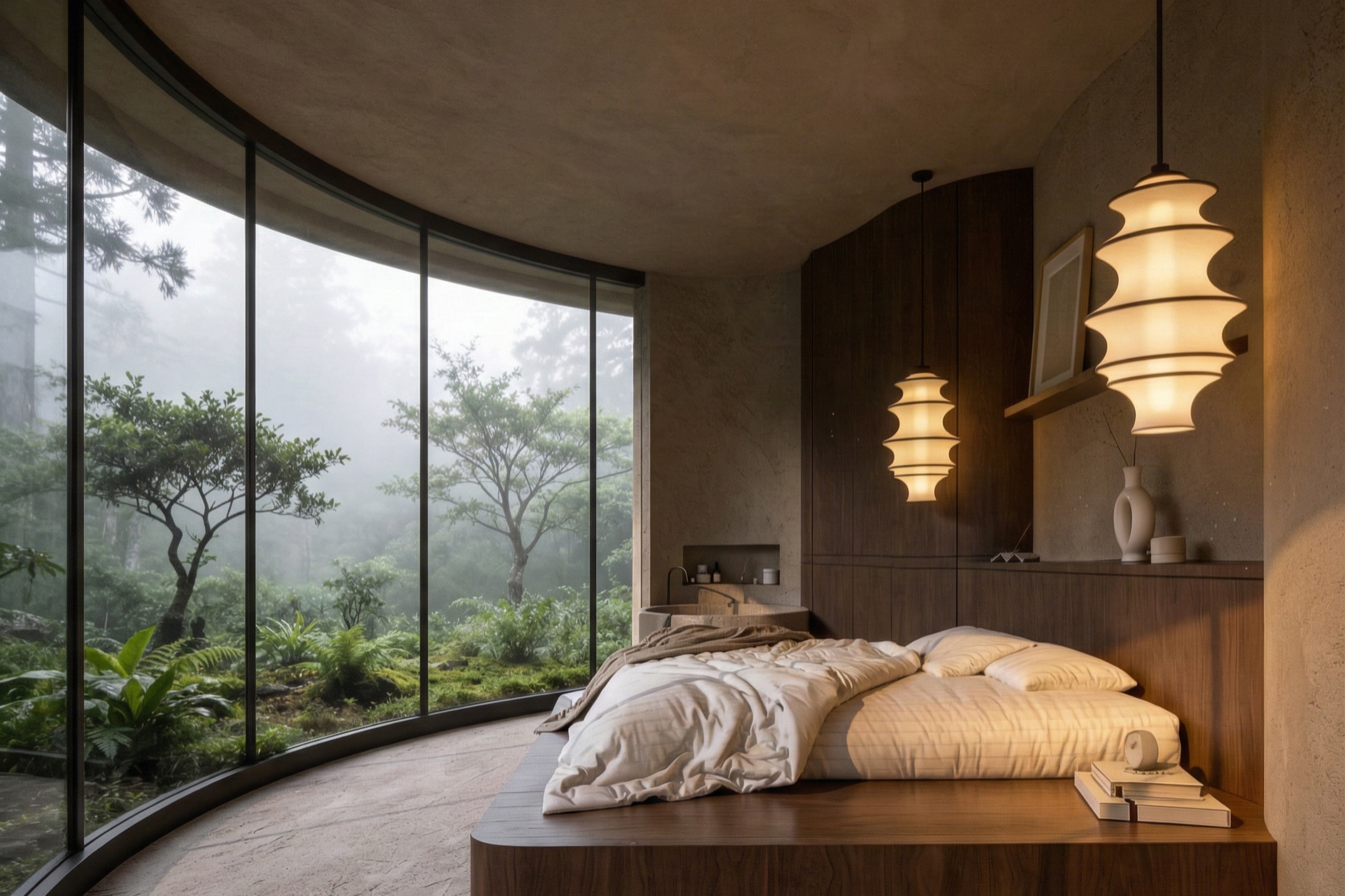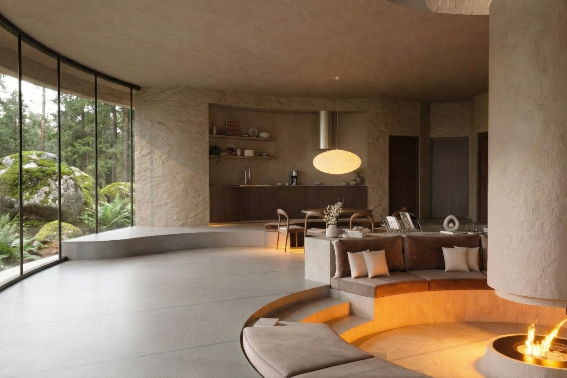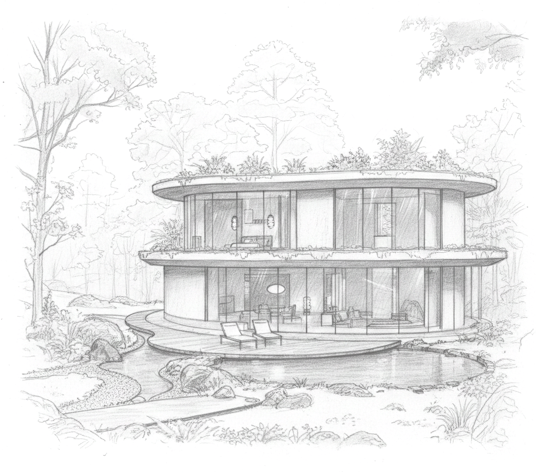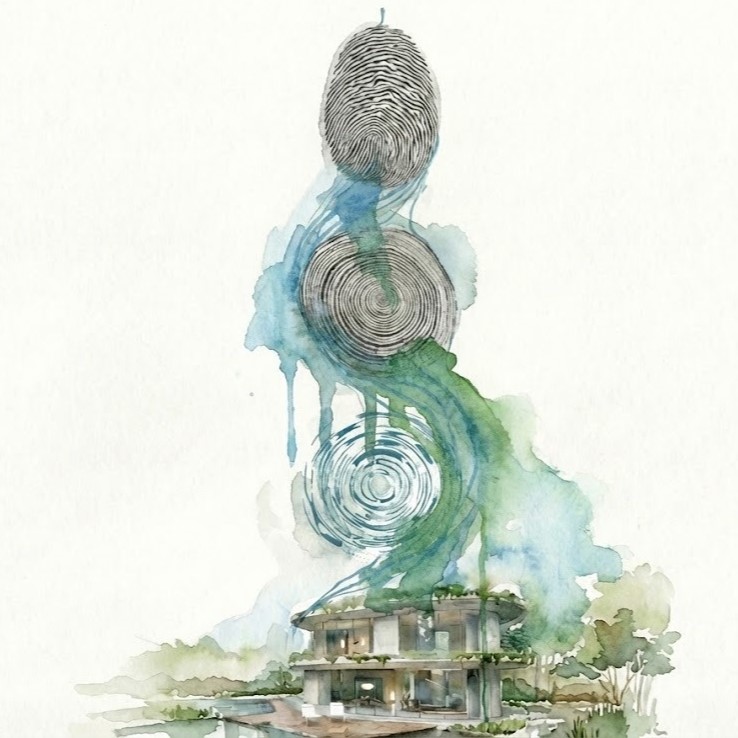The spiral of a human fingerprint, the growth rings of Yakusugi cedar trees, and ripples formed by raindrops express a shared continuity across scales. Informed by this trace language, the mass bends with topography and water direction. Circulation unfolds from an inner core outward like a spiral, creating moments of pause. Cedar and stone record time, climate, and memory.