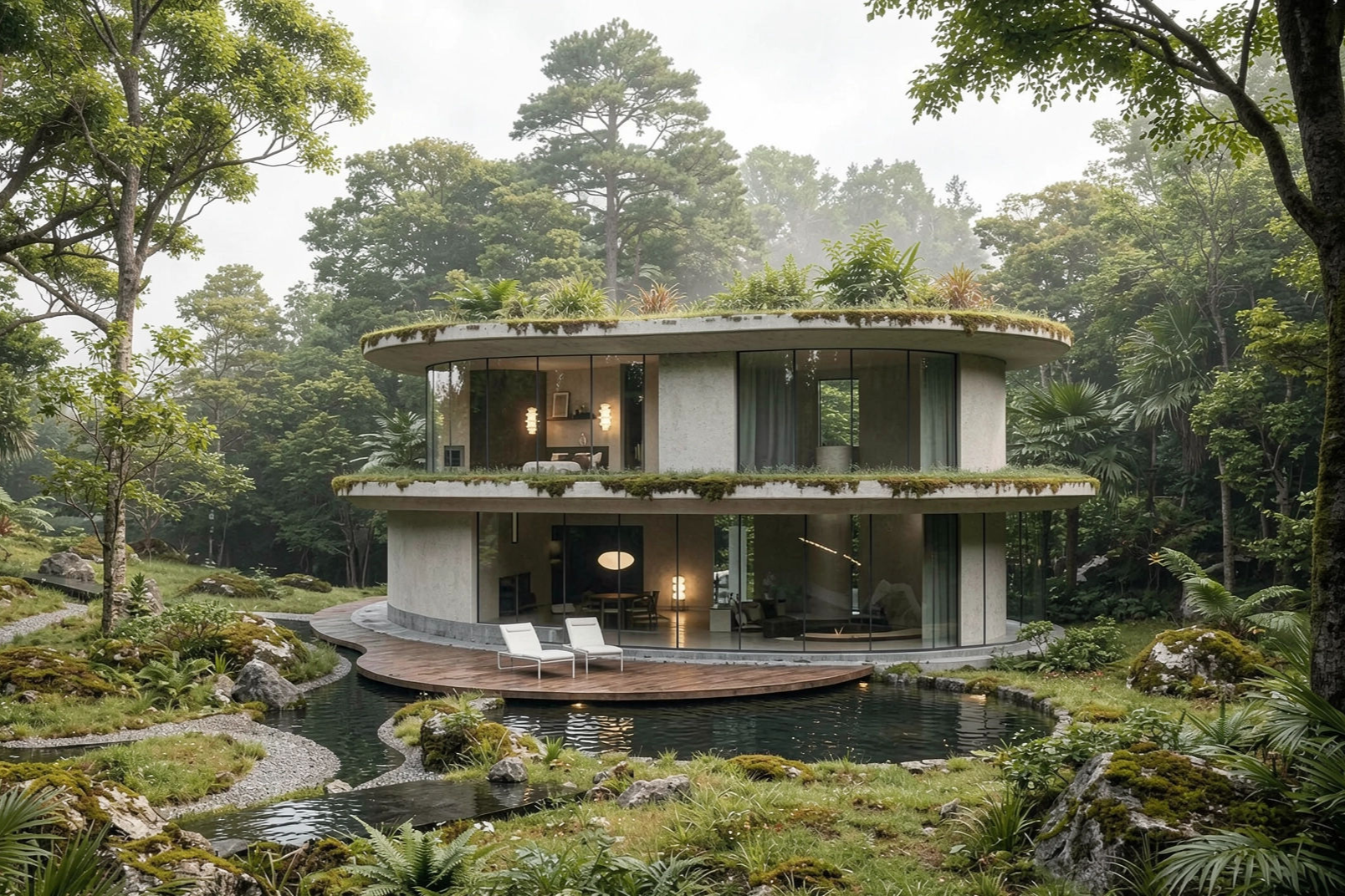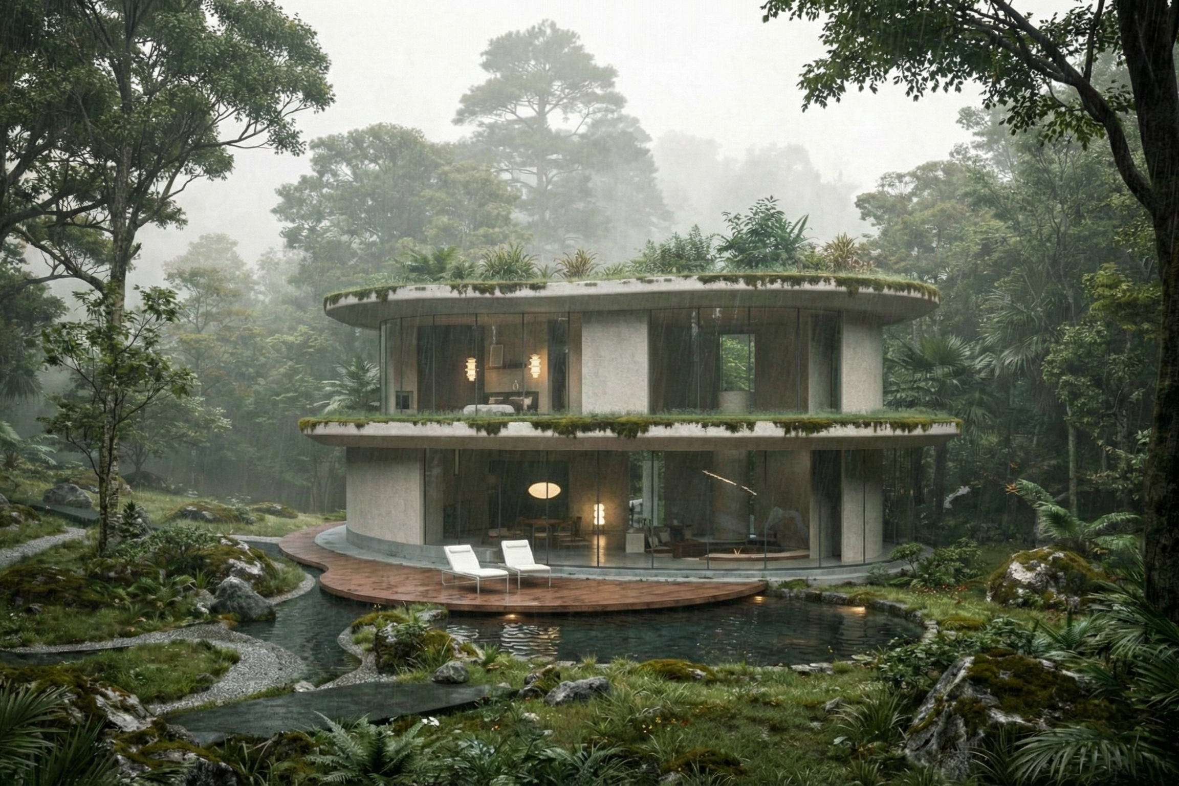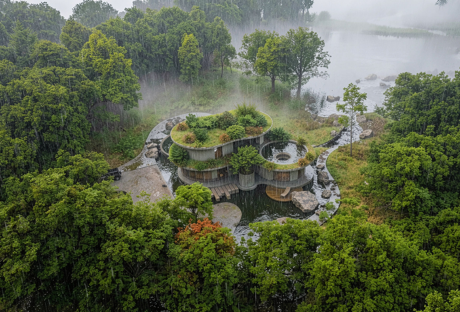 Yakushima is an island sustained by the uninterrupted cycle of water. Rising as mist, falling as rain, and flowing across the land before returning to the sea, water shapes topography, nourishes forests, and structures life. The project seeks coexistence with this cycle.